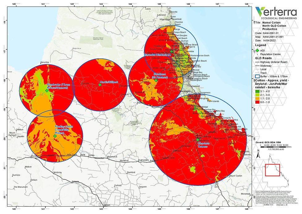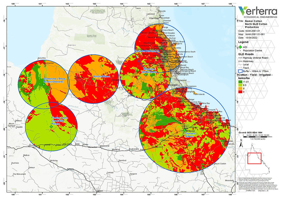 In order to provide confidence in cotton production potential, Namoi Cotton commissioned a study in relation to potential cotton production areas in Far North and North-West Queensland. Among other things this study assessed the potential extent of land available and suitable for cotton production within an economic transport distance around six “nodes” distributed across the Gulf Coast and Cape York region. Within areas suitable for cotton production, expected yield was modelled, and potential long-term climate change impacts on yield forecast.